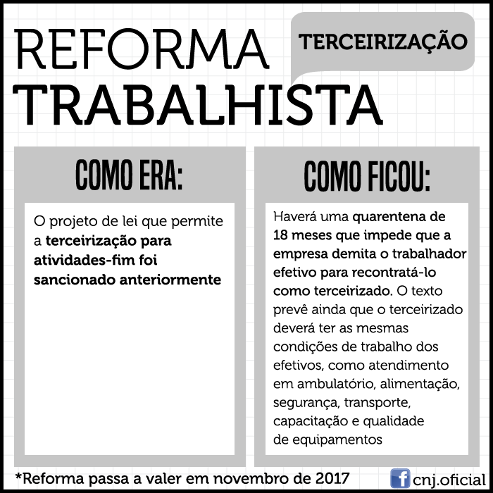 A reforma trabalhista foi aprovada pelo Senado no dia 11 de julho. A casa ratificou as novas regras que dilaceram o código que rege as leis trabalhistas, a CLT, depois de um acordo com o governo. A Câmara já havia aprovado o texto em abril. Com a passagem pelo Congresso, o governo sancionou a medida no dia 13 de julho. O acordo que permitiu a aprovação no Senado envolve um compromisso do governo de alterar, via Medida Provisória, as questões que os senadores e senadoras levantaram. Na prática, a manobra acelerou a aprovação das novas regras. A partir da aprovação, a reforma entrará em vigor em 120 dias (em novembro deste ano), um “presente” para todos as trabalhadoras e trabalhadores brasileiros.