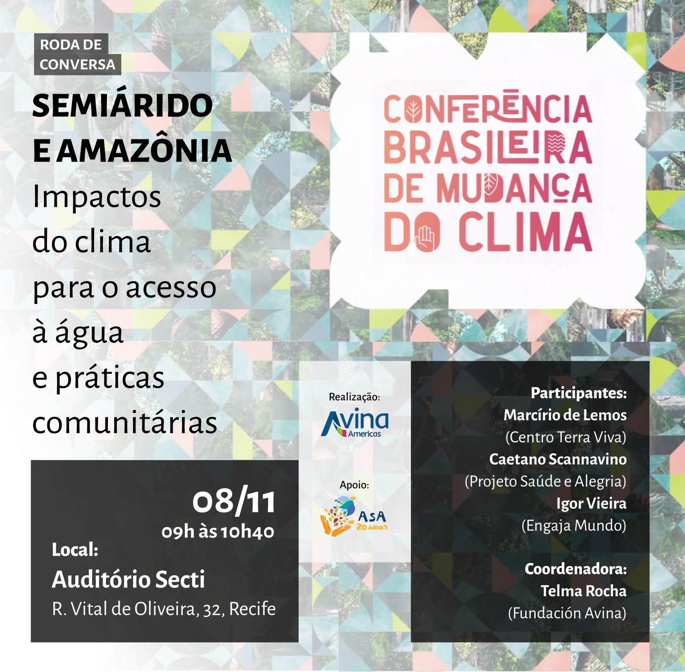 Amanhã de manhã, das 9h às 10h40, haverá a roda de conversa “Semiárido e Amazônia – impactos do clima para o acesso a água e práticas comunitárias”, com participação de Marcírio de Lemos, da coordenação executiva nacional da ASA e do Centro Terra Viva (RN), e de Caetano Scannavino, do Projeto Saúde e Alegria. A coordenação da roda é de Telma Rocha da Fundação Avina. Local: Secretaria de Ciência, Tecnologia e Inovação de Pernambuco.