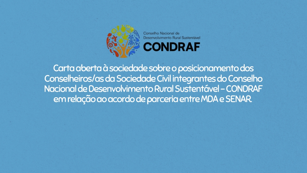 Nós, membros da Sociedade Civil Organizada do Conselho Nacional de Desenvolvimento Rural Sustentável – CONDRAF fomos surpreendidos pelo Acordo de Cooperação Técnica – ACT nº 22/2025 celebrado entre o Ministério do Desenvolvimento Agrário – MDA e o Serviço Nacional de Aprendizagem Rural – SENAR, entidade vinculada à Confederação da Agricultura e Pecuária do Brasil (CNA), ligada ao setor patronal rural.