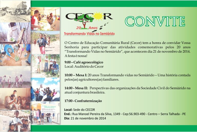 Nos dias 20 e 21 de novembro, o Centro de Educação Comunitária Rural (CECOR), Organização Não Governamental com sede em Serra Talhada e atuação nos Sertões do Pajeú, Central, Moxotó e Submédio São Francisco, vai comemorar vinte anos de fundação.…